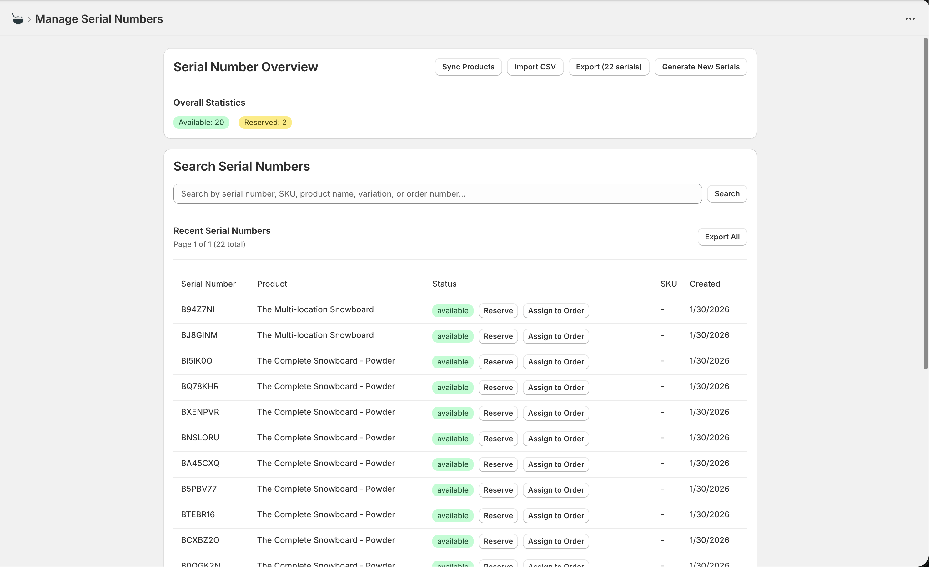 Track every serial assignment with timestamps and order history. See exactly when a serial was assigned, by whom, and to which order—perfect for audits and compliance.